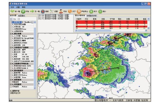 6 基于新一代天气雷达的强对流天气临近预报预警系统预报方程、风暴单体识别和跟踪算法、风暴位置预报方法建立后,为实现强天气的自动预警预报,我们用VC开发了冰雹、雷雨大风临近预报预警系统(图 2),该系统实时自动读取当天探空资料-20℃与0℃层高度,并对新一代天气雷达风暴自动识别的结果进行显著回波风暴(风暴强中心大于50 dBz、VIL>20 kg·m-2、ET>8 km)的判断,若为显著回波风暴则根据相应的新一代天气雷达产品计算冰雹和雷雨大风的判断指标,代入预报方程进行强天气判断,预报将出现冰雹、雷雨大风天气时,系统自动在地理信息图上显示位置,预报其未来30分钟、60分钟的移动方向和位置,并通过声音、文本预警,为强天气系统下游影响区域提供临近预报。
