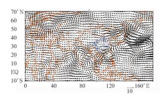 图 12 2014年6月6—18日850 hPa风矢量距平(单位:m·s-1) Fig. 12 850 hPa anomalous wind vectors averaged from 6 to 18 June 2014 (unit: m·s-1) |