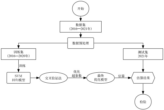 为找出最优的超参数(核函数超参数γ、惩罚项C和损失距离ε),结合贝叶斯优化的最佳参数智能搜索方法,使用交叉验证法(Kohavi,1995)(取2016—2020年训练组数据的其中一年作为验证集,其余4年为训练集,重复5次),以所有验证集的均方根误差(root mean square error,RMSE)作为评估指标,对超参数进行优化,从而得到最终优化后的模型。