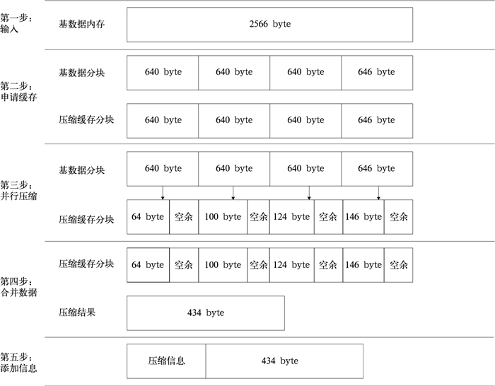 3 并行优化方案设计 3.1 压缩和解压的方案设计从压缩算法的原理可以获知, 压缩过程是需要对数据进行扫描, 构建编码表或预测其数据特征, 以此减少冗余的数据, 常见的通用算法例如LZ77/LZ78(Lempel-Ziv, 由Abraham Lempel和Jacob Ziv发布于1977/1978)、LZMA(Lempel-Ziv-Markov chain-Algorithm, 一个Deflate和LZ77算法改良和优化)、Huffman Coding(David Albert Huffman于1952年发明)、Burrows-Wheeler变换(Michael Burrows和David Wheele于1994年发明)等(韩强等, 2019)。压缩过程中输入的数据是流式处理的, 即过程本身是串行的, 因此单个数据块的压缩过程很难实现并行, 要缩短压缩时间, 最有效的手段是将数据通过分块压缩, 实现压缩过程的并行化。