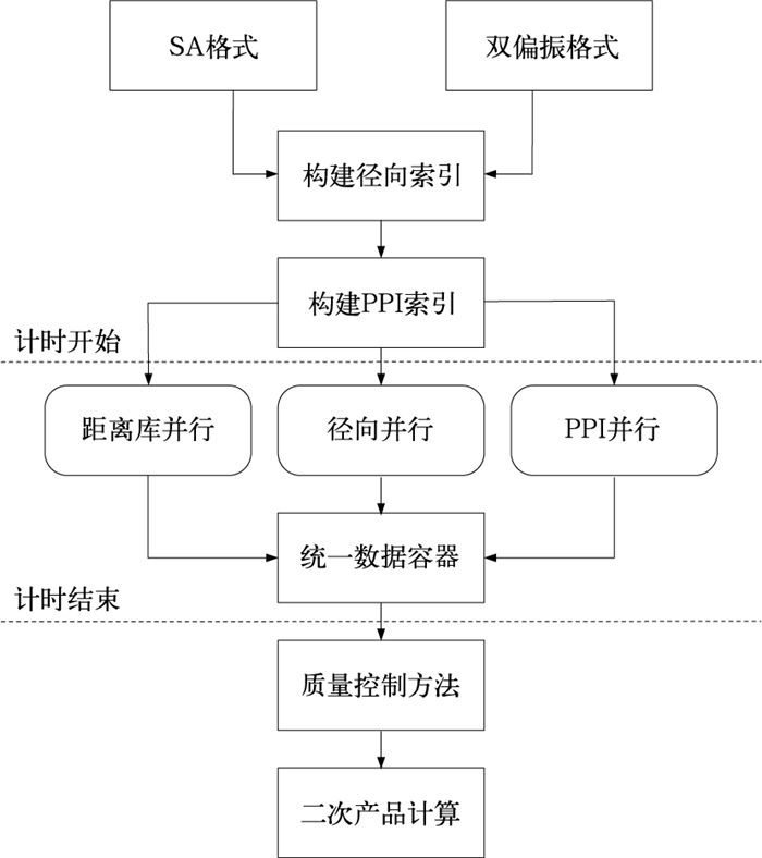 天气雷达基数据有多种格式, 不同的雷达数据格式总体遵循径向数据集合的原则, 包含PPI、径向、距离库、观测要素四个维度, 有些格式具有文件头, 包含不同PPI层次的数据定位信息, 有些则只是存粹的径向数据集合(比如SA雷达格式), 每种格式的解码过程首先需要定位各个径向的入口, 然后根据径向划分出PPI的层级, 再根据不同并行颗粒进行解码对比, 从而获得一个最优的颗粒度。观测要素从属于距离库, 因此本方案测试了距离库、径向、PPI三个颗粒度的并行, 具体流程如图 6所示。