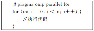 OpenMP代码中, 并行区域是核心的代码段, 由#progma omp parallel声明, 其后大括号内的代码会使用多个线程同时处理, 更常见为使用#progma omp parallel for声明, 将代码下一行的for循环使用多线程执行, 从而充分利用多核CPU, 极大提高处理效率。如下代码所示: