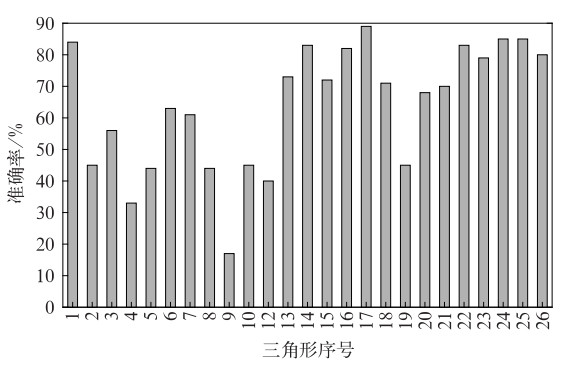 利用天气雷达组合反射率因子数据, 根据对流触发降水事件判别方法, 提取出风廓线雷达组网所有三角形在2023—2024年4—9月对流触发事件共1100次。通过风廓线雷达组网的每个三角形区域范围与天气雷达时空匹配后, 在地面气象观测站统计的763次降水事件中, 有552次符合判别指标, 属于对流触发降水, 其余211次不属于对流性降水, 故而对流触发信号判别指标的准确率为72.3%, 误报率27.7%。其中每个三角形(剔除钝角和面积较小的三角形T9和T11)对流触发降水的准确率如图 9所示。