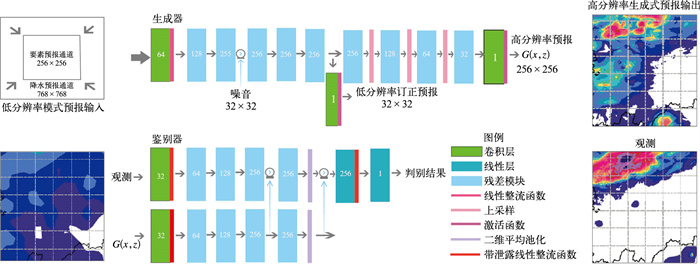 图 3 基于生成式对抗神经网络结构的短时降水预报技术示意图 Fig. 3 Short-time precipitation forecasting technology based on the structure of conditional generative adversarial network |
