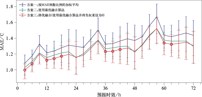 图 6 2023年3月至2024年2月全国2411个国家级气象观测站平均的不同融合算法、不同时效气温融合预报的平均绝对误差(MAE) 注:空心圆表示方案三的预报效果相较方案二有所提升,且该提升通过了0.05显著性水平的F检验;彩色条竖枝表示各个算法的误差范围,竖枝顶端、底端的横杠分别对应第75%、第25%分位数。 Fig. 6 The MAE of the average fused temperature forecasts with different fused algorithms and different lead times at 2411 national meteorological stations in China from March 2023 to February 2024 |