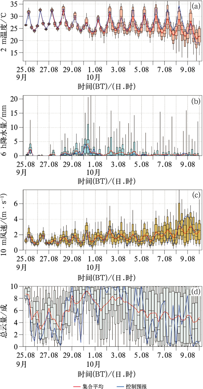 图 3 2025年9月25日08时至10月10日08时(起报时间为9月25日08时)北京站逐6小时数值模式集合预报的气象要素时间序列和箱线图(a)2 m气温,(b)6 h降水量,(c)10 m风速,(d)总云量 Fig. 3 Box plot with time series of meteorological elements of ensemble forecast by 6 h numerical model at Beijing Station from 08:00 BT 25 September to 08:00 BT 10 October 2025, initiated at 08:00 BT 25 September (a) 2 m temperature, (b) 6 h precipitation, (c) 10 m wind speed, (d) total cloud cover |