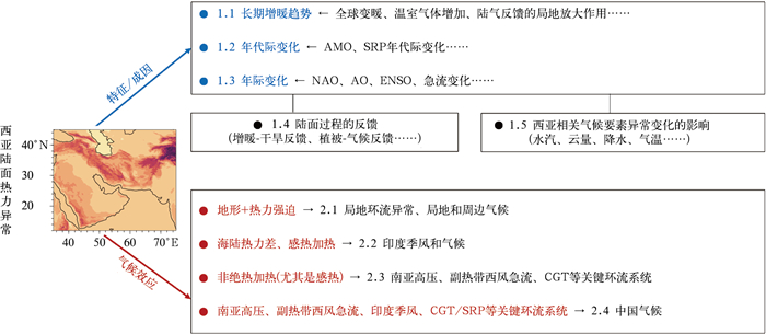 图 2 西亚陆面热力异常与成因及气候效应研究进展总结 Fig. 2 Summary of recent advance in the research on land surface thermal anomalies and their possible causes and climatic effects in West Asia |