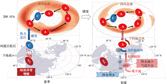 图 4 西亚春季陆面热力异常影响我国北方初夏气候物理机制示意图(Yang et al,2021) 注:WA、NC、NEC分别代表西亚、中国华北和中国东北地区;粗箭头代表风向;200 hPa上A/C代表反气旋/气旋异常环流,细箭头代表Rossby波传播方向,填色深/浅为强/弱西风急流。 Fig. 4 Schematic diagram on physical mechanisms of spring land surface warming in West Asia affecting early summer climate over northern China (cited from Yang et al, 2021) |