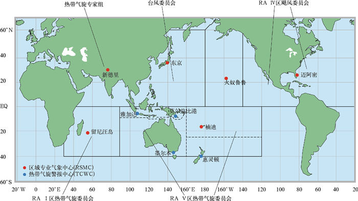 WMO于1980年设立热带气旋计划(Tropical Cyclone Programme,WMO/TCP),并在此基础上设立了与五个区域性热带气旋委员会相对应的台风领域的区域专业气象中心(Regional Specialized Meteorological Centre,RSMC),这些中心为区域内的成员提供防台减灾协助(包括对区域内的热带气旋进行编号和命名,提供预报指导产品和培训等)。其中亚太台风委员会RSMC的台风中心于1988年设立,位于日本东京(RSMC-Tokyo)。该中心在WMO的授权下对西北太平洋地区的台风进行编号和命名,并通过WMO框架下的业务网络为亚太台风委员会的成员提供其区域台风数值模式的实时客观预报产品。其余RSMC台风中心的设置区域详见图 1。TCP旨在通过在国家和区域层面实施的合作行动,建立涵盖成员国、WMO地区协会、其他国际和地区机构以及WMO秘书处和RSMC等在内的国家和区域协调系统,以确保热带气旋造成的生命和财产损失降至最低。具体包括:鼓励和支持其成员建立国家防台减灾体系,建立成员间的热带气旋预报及风险评估等产品共享和技术转移及培训等,以及指导和协助各区域委员会制定及修订区域内的台风灾害联防操作手册。事实上,TCP是统筹和协调全球防台减灾相关事务的重要平台,其办公室(处级)位于WMO总部。