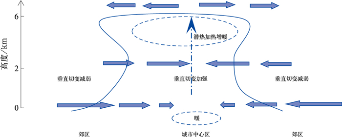 城市热岛效应对于加强对流性降水十分重要(Niyogi et al, 2011; Ryu et al, 2016)。北京城区对暴雨影响的研究表明,城市对风暴系统的触发、演变和移动产生了重要影响(Guo et al, 2006; Miao et al, 2011; Dou et al, 2015)。孙继松等(2006)从观测事实入手, 结合中尺度理论分析, 揭示了发生在北京城区的一次孤立的β中尺度深对流暴雨系统的启动机制以及城市边界层在这次局地暴雨过程中的动力学作用,研究指出:城市与郊区下垫面属性不同造成的热力差异,有利于形成城市中尺度地面风场辐合线;更为重要的是,城市热岛形成的水平位温梯度还可能造成城区边界层内风场垂直切变加强:近地面层风速减弱,边界层顶部气流加速,而在郊区则相反,近地面层出现明显的气流加速。因此,与城市地面中尺度辐合线对应的实质上是一个较为深厚的水平风速辐合系统,非常有利于对流系统在城区被触发和组织, 或者对外界移入的对流系统有明显的加强作用;而对流潜热释放在城市上空形成的“热塔”效应进一步造成了边界层顶的入流加速,有利于对流初始阶段的快速发展。图 1为由城市热岛触发对流暴雨的概念模型(改绘自孙继松等,2006的论文)。