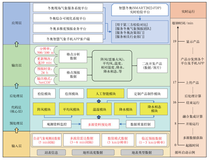 通过“分钟级”快速更新无缝隙融合计算,最终在输出层生成NetCDF格式的各气象要素0~24 h格点分析和预报数据产品。此外,输出层还可以通过二次处理生成定制数据和图片产品,满足不同用户需求。睿思系统每10 min启动一次,产品最晚滞后墙钟时间19 min(图 1)。北京冬奥会期间,应用层主要通过冬奥业务平台和手机APP提供给预报员、决策部门等使用,另外还将数据产品实时推送到SMART2022-FDP平台进行第三方检验(陈明轩等,2024)。“后冬奥”时代,应用层除了日常气象业务和国家重大活动服务保障外,还进一步扩展到民航、水文、电力等交叉行业。
