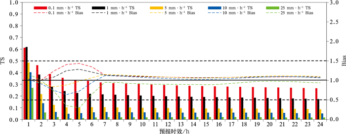图 11 2021—2024年汛期(6月1日至9月15日)京津冀地区睿思系统0~24 h预报时效的逐小时累计降水预报TS评分和Bias评分 注:粗黑横实线指示Bias最佳评分为1,粗黑横虚线指示Bias可容忍评分区间为[0.5, 1.5]。 Fig. 11 Hourly precipitation verification (TS score and Bias score) of the 0-24 h fused precipitation forecasts from the RISE system in the Beijing-Tianjin-Hebei Region during the flood season (1 June to 15 September) from 2021 to 2024 |