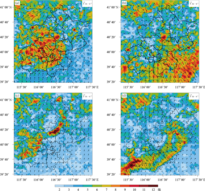 图 14 2024年5月30日睿思系统基于多源数据动力-统计协同融合阵风预报方法的北京地区(a)15:00和(b)16:00阵风格点分析场,以及11:00起报的(c)15:00和(d)16:00阵风格点预报场 注:填色表示蒲福风级(8级对应的风速≥17.2 m·s-1),风矢为风场。 Fig. 14 Gridded gust analysis at (a) 15:00 BT and (b) 16:00 BT and gridded gust forecast at (c) 15:00 BT and (d) 16:00 BT initiated at 11:00 BT based on the dynamical-statistical collaborative method with multi-source-data fusion in the RISE system for the case on 30 May 2024 in Beijing Region |
