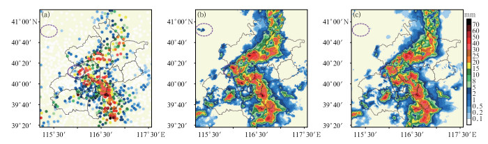 图 2 2024年7月24日19:00的1 h累计降水量 注:紫色虚线框所示为系统性降水高估区域,紫色实线框所示为北京西部降水高估区域。 (a)自动站观测降水量,(b)以固定Z-R关系QPE为背景场的睿思系统融合分析场,(c)以双偏振参量瓦片分区QPE为背景场的睿思系统融合分析场 Fig. 2 1 h accumulated precipitation at 19:00 BT 24 July 2024 (a) observed precipitation from AWSs, (b) RISE system fusion analysis using the fixed Z-R relationship-based QPE as the background field, and (c) RISE system fusion analysis using tile-based partitioning QPE as the background field |
