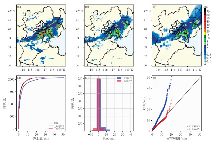 图 4 Q-matching方法在京津冀地区雷达QPE中的试验表现 (a)订正前的QPE分布,(b)Q-matching方法订正后的QPE分布,(c)AWS观测降水量分布,(d)降水频率分布,(e)订正前后QPE与AWS观测偏差,(f)订正前后QPE与AWS观测散点图 Fig. 4 Performance of Q-matching correction in radar QPE over the Beijing-Tianjin-Hebei Region (a) QPE distribution before Q-matching correction, (b) QPE distribution after Q-matching correction, (c) precipitation distribution from AWS, (d) precipitation frequency distribution, (e) Bias and (f) ratio comparison of AWS with no-corrected QPE and post-corrected QPE |