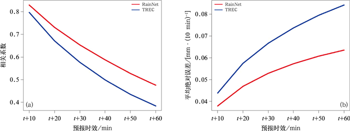 图 6 2020年6—9月1 h累计降水量 (a)相关系数和(b)平均绝对误差随预报时效的变化 Fig. 6 Variations of (a) correlation coefficient and (b) mean absolute errors with forecast lead time for 1 h accumulated precipitation from June to September 2020 |