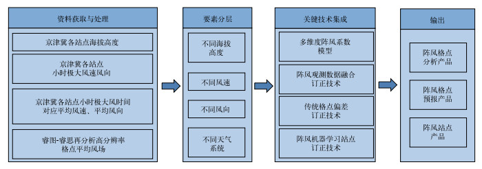 雷暴大风是主要的致灾强对流天气类型之一,而且形成机理复杂、预报难度极大(崔新艳等,2025)。针对京津冀地区雷暴大风精细化预报需求,Yang et al(2024)首先基于京津冀长时间序列AWS观测和睿思系统高分辨率再分析资料,利用描述统计和推断统计方法对不同海拔高度、不同季节、不同风速和风向区间的阵风气候态分布特征和时空演变规律进行分析,获取阵风在各要素不同区间的集中趋势、离散程度和相关程度,并利用概率统计方法计算阵风、阵风系数与各要素之间的概率统计关系(Yang et al, 2024),建立了阵风系数与稳定风速、风向、地形高度各要素之间的关系模型。然后,将构建的京津冀多维度阵风系数模型与阵风观测数据(AWS极大风观测)的融合订正(杨璐等,2023)、格点偏差订正(杨璐等,2022)等模式后处理订正技术进行集成耦合,建立了基于多源数据动力-统计协同融合的阵风预报流程(图 7),在睿思系统中实现了阵风(雷暴大风)的“百米级、分钟级”客观预报。