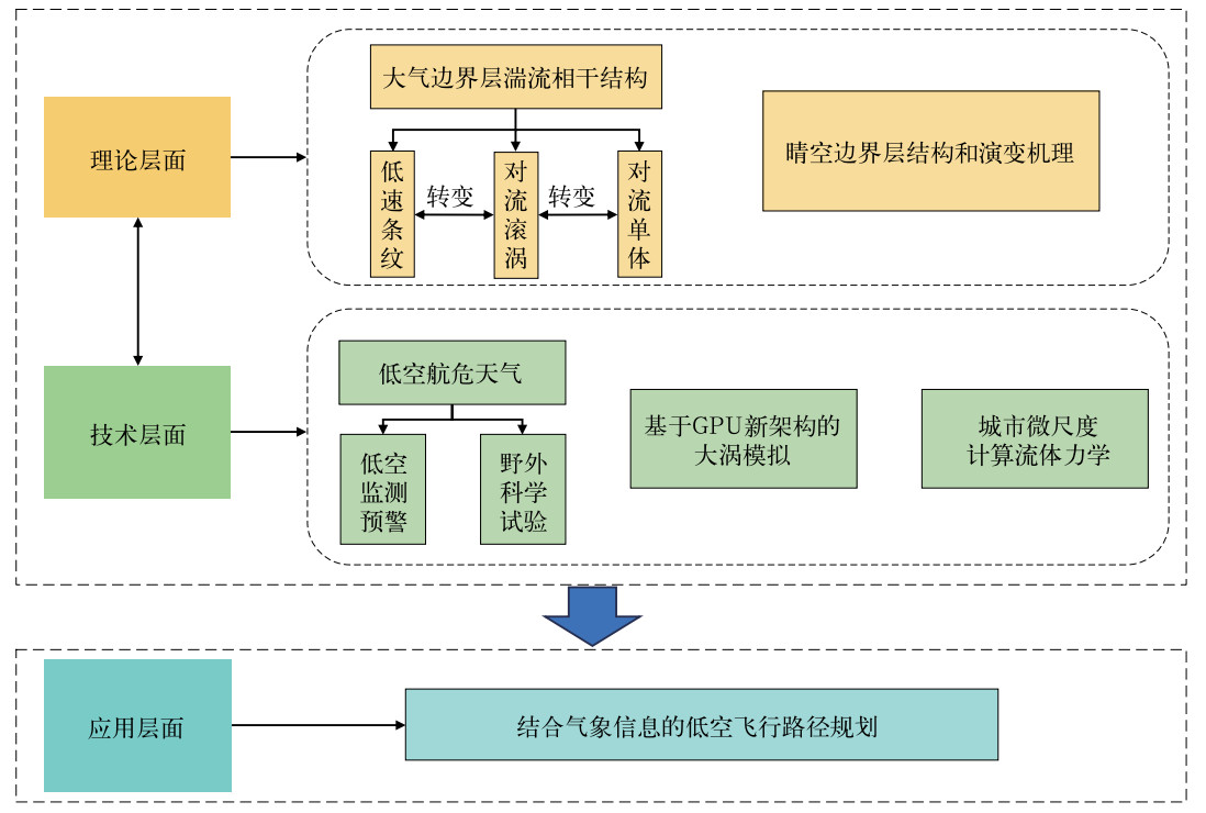 1 低空经济气象研究主要进展低空经济气象包括边界层气象理论体系的构建、低空航危天气监测预警技术方法创新以及依托二者融合所形成的实际应用,目前已取得了显著进展,具体框架见图 3。在理论和机理方面,主要体现在对大气边界层湍流相干结构及其转变机制的深入揭示,以及对晴空边界层结构与演变机理的详细阐明。在技术层面,重点突破包括针对低空航危天气的低空监测预警技术及其支撑性野外科学试验,以及基于图形处理单元(GPU)新架构的高精度大涡模拟及城市微尺度计算流体力学方法。在应用层面,研究致力于结合精细化气象信息实现低空飞行路径的智能规划与优化。下面将围绕上述三个层面,系统梳理低空经济气象研究的主要进展。