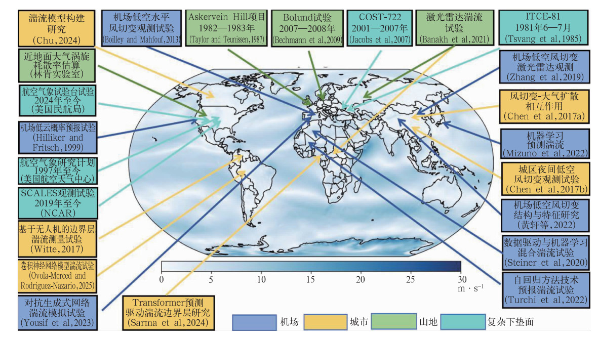 图 4 全球围绕低空航危天气监测预报预警开展的野外科学试验空间分布 注:填色表示地面100 m平均风速。 Fig. 4 Spatial distribution of global field scientific experiments on monitoring, forecasting, and early warning for low-altitude flight hazardous weather |