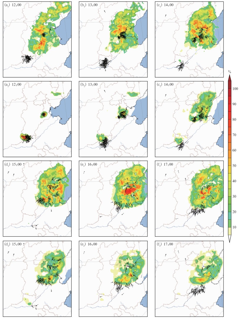 图 3 (a1~f1)CMA-MESO模式预报与(a2~f2)融合模式与多源观测数据的预报比较:2021年7月30日11时起报的6 h 预报时效雷暴大风的发生概率(填色) 及相应时刻国家站观测实况(风羽) Fig. 3 Comparison of (a1-f1) CMA-MESO model forecast and (a2-f2) fusion model forecast with multi-source observation data: the occurrence probability (colored) of severe convective winds with 6 h lead time initiated at 11:00 BT 30 July 2021 and the observed winds (barb) at the national meteorological stations at the corresponding time |