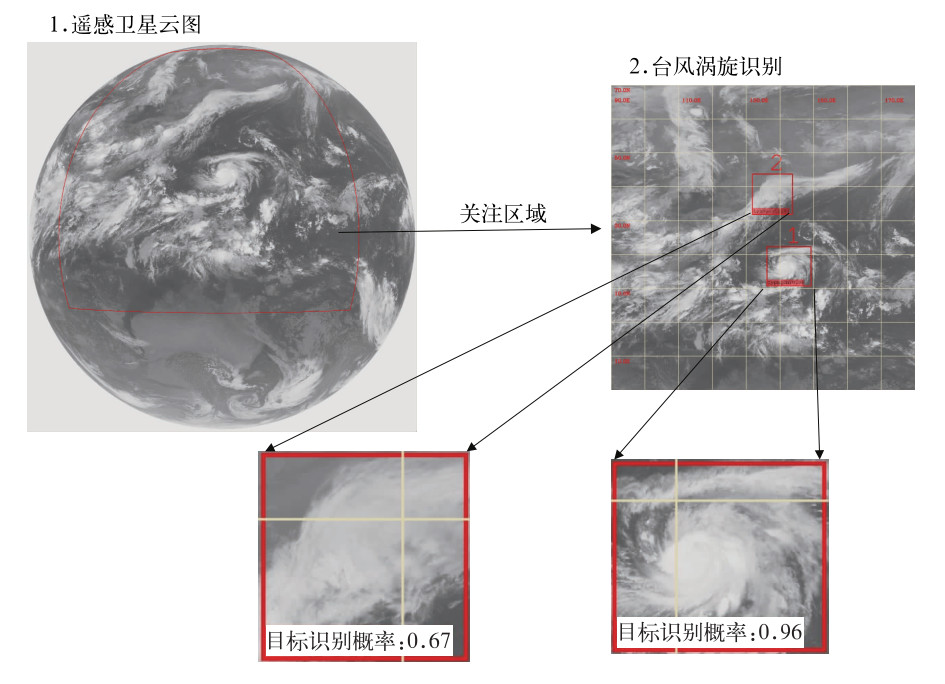 图 4 基于目标检测的深度学习模型(SSD)自动识别台风涡旋示例 Fig. 4 Typhoon vortex auto-detection based on SSD object detection method |