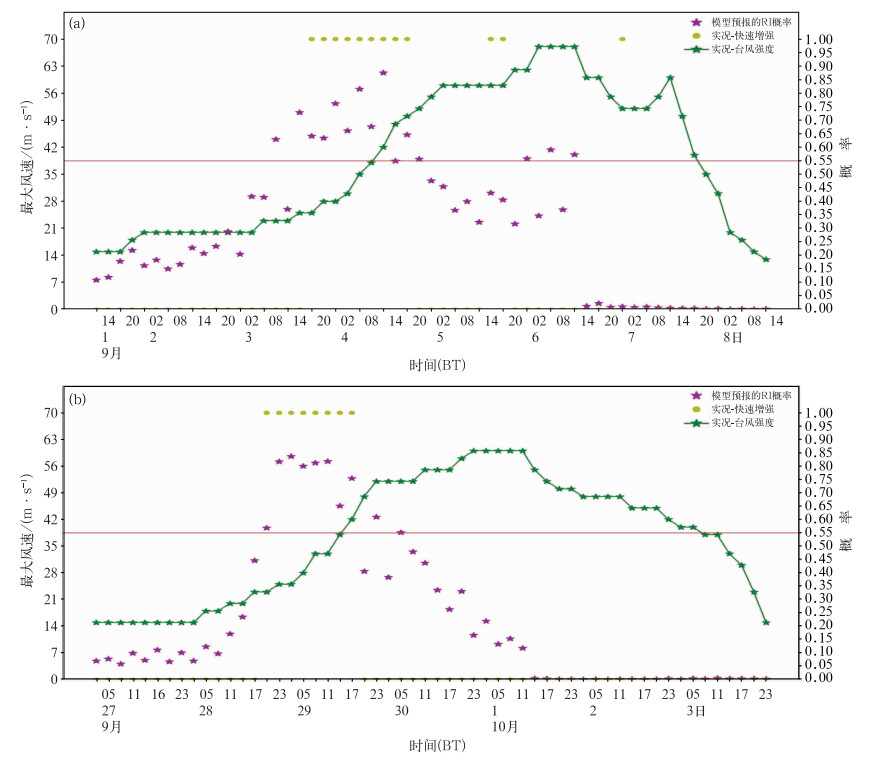 判别为将发生RI。 Fig. 5 Rapid intensification (RI) probability predicted by the model based on LSTM compared to the observed RI (a) Typhoon Yagi, (b) Typhoon Krathon