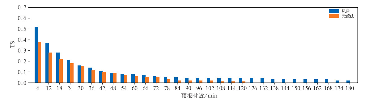 图 6 “风雷”模型与SWAN3.0光流外推对≥50 dBz对流回波的预报技巧TS评分比较:2023 年全国范围逐6 分钟外推降水预报 Fig. 6 Threat score (TS) comparison for convective echo forecasts between the Fenglei model and SWAN3.0 optical flow extrapolation: verification of nationwide 6 min precipitation forecast extrapolation in 2023 |