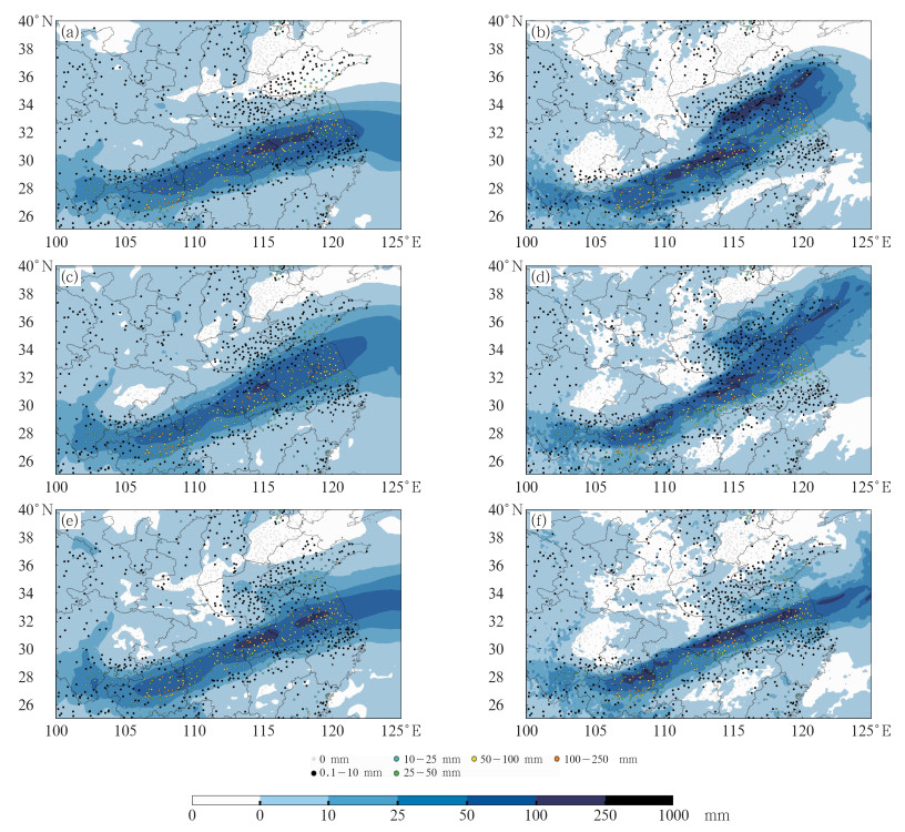 图 7 (a, c, e)“风清”模型、(b, d, f)ECMWF-IFS模式不同时效的24 h累计降水量预报(填色) 与观测实况(散点) :2024 年6 月29 日长江中下游暴雨过程(a,b)36 h,(c,d)84 h,(e,f)144 h Fig. 7 Comparison of the (a, b) 36 h, (c, d) 84 h and (e, f) 144 h forecasts for 24 h accumulated precipitation by (a, c, e) FengQing model and (b, d, f) ECMWF-IFS model during a torrential rain event in the middle and lower reaches of the Yangtze River on 29 June 2024 |