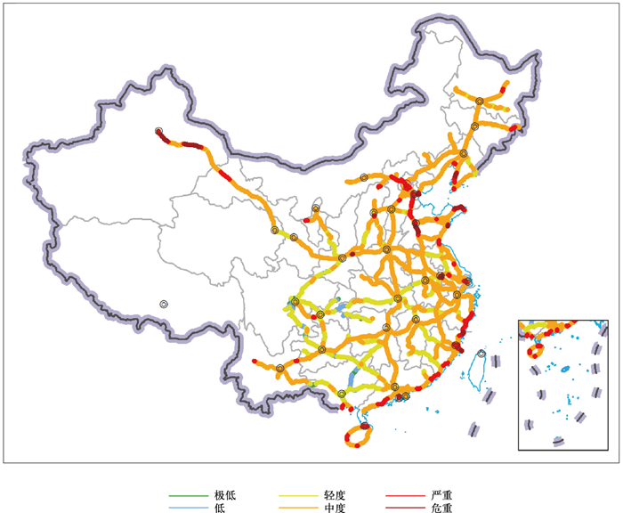 2 交通气象灾害风险评估进展 2.1 公路交通气象灾害风险评估为有效减轻气象灾害对公路交通的影响,我国自2005年起由中国气象局与交通运输部联合推动公路交通气象预报预警服务体系建设,在高影响天气监测、风险评估、预警预报、观测技术、信息共享标准及应急减灾等领域取得显著进展。