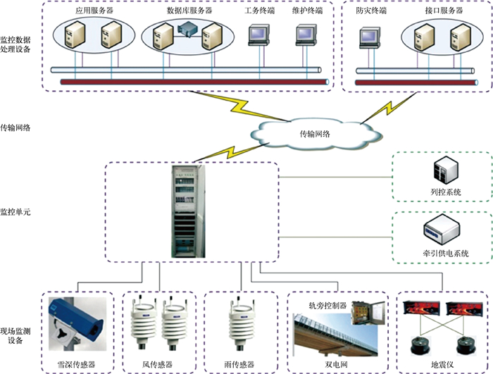3.2 高速铁路综合防灾预警系统我国高速铁路自然灾害及异物侵限监测系统包含风监测子系统、雨量监测子系统、雪深监测子系统、地震监测子系统及异物侵限监测子系统,系统由现场监测设备、监控单元、监控数据处理设备和监控终端组成,与调度指挥、信号系统等系统互联并构成运输安全保障体系(图 2)。系统采用铁路局中心系统与现场监测设备两级架构,实时采集高速铁路沿线风、雨、雪、地震以及上跨道路桥梁的异物侵限数据,同时接入既有灾害监测系统、相邻铁路局中心系统以及地震、气象等外部部门信息,进行综合分析与处理,为运营管理提供准确、可靠的监测、预警与报警信息。在发生异物侵限报警或地震预警时,系统能够联动触发信号系统与牵引变电系统执行紧急处置。列车调度员可依据风雨天气、地震灾害及异物侵限等安全环境的实时监测与预警信息,指挥列车运行;维护部门则根据系统提供的灾害信息,及时开展线路及设施的巡检、抢险与维修养护工作,从而为高速铁路动车组的安全运行提供全方位技术保障。