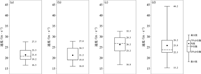 图 10 中层中气旋最大旋转速度箱线图 (a,c)龙卷发生前(a)24 min、(c)6 min,(b,d)非龙卷发生前(b)24 min、(d)6 min Fig. 10 Box plots of the maximum rotational velocity for the mid-level mesocyclone (a) 24 min and (c) 6 min before the occurrence of tornadoes, (b) 24 min and (d) 6 min before the occurrence of non-tornadoes |