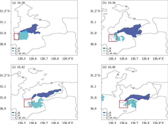 2021年5月14日18:50—19:05,江苏苏州盛泽地区发生EF3级龙卷,龙卷影响时最大风力达到17级。图 2显示其低层1 km等高平面上ZDR弧(深蓝色区域)和ZDR柱(浅蓝色区域)在龙卷发生前的演变。从18:30(图 2a)到18:48(图 2d),低层ZDR弧面积有所增大,同时ZDR弧向钩状回波头部处(图 2红框)延伸。