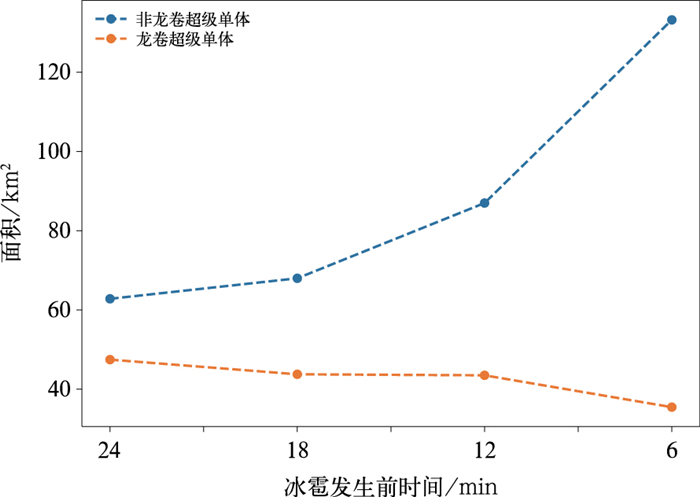 图 3 非龙卷超级单体和龙卷超级单体冰雹区域平均面积时间演变 Fig. 3 Temporal evolution of average area of the hail zone in non-tornadic supercells and tornadic supercells |