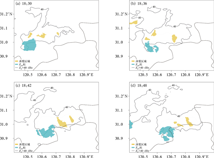 此外,本研究同时发现,非龙卷超级单体中冰雹区域更倾向于向后侧下沉气流处伸展,而龙卷单体中冰雹区域出现在前侧下沉气流区域。2021年5月14日影响苏州盛泽地区的超级单体,初始触发生成于安徽郎溪西南侧,16:54左右已加强为超级单体移入太湖地区,17:50—18:00还未产生龙卷前,先引发了32 m·s-1的雷暴大风。17:24—17:42此超级单体3.5 km等高平面上冰雹区域(图 4黄色区域)不断增大,从75.11 km2增大到187.21 km2,此时风暴移动方向方位角为270°,冰雹区域更倾向于向风暴移动的后侧下沉区域伸展,逐渐靠近并进入ZDR柱(图 4蓝色区域)表征的上升气流区。范围大且向后侧下沉气流区延伸的冰雹区域理论上将产生范围更大的冷区和更强的后侧阵风锋,这将限制通常位于风暴右后侧的超级单体上升气流。