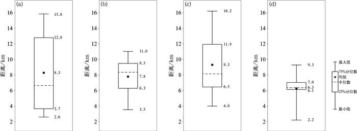 图 6 1 km等高平面上KDP足质心和ZDR弧质心的分离距离箱线图 (a,c)龙卷发生前(a)24 min、(c)6 min,(b,d)非龙卷发生前(b)24 min、(d)6 min Fig. 6 Box plots of the separation distance between the centroids of KDP foot and ZDR arc at 1 km AGL (a) 24 min and (c) 6 min before the occurrence of tornadoes, (b) 24 min and (d) 6 min before the occurrence of non-tornadoes |