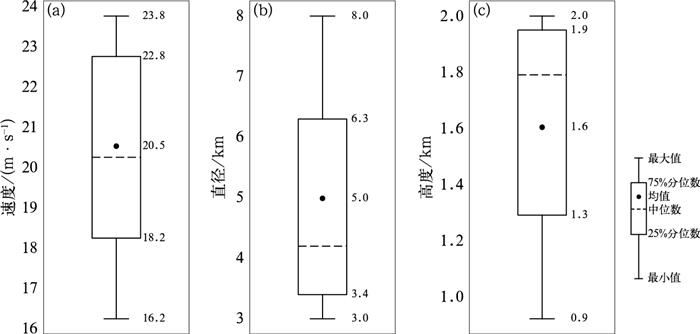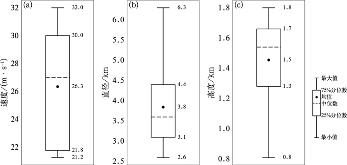 图 7 龙卷发生前24 min低层中气旋箱线图 (a)最大旋转速度,(b)直径,(c)最大旋转速度高度 Fig. 7 Box plots of the low-level mesocyclone 24 min before the occurrence of tornadoes (a) maximum rotational velocity, (b) diameter, (c) height of maximum rotational velocity |