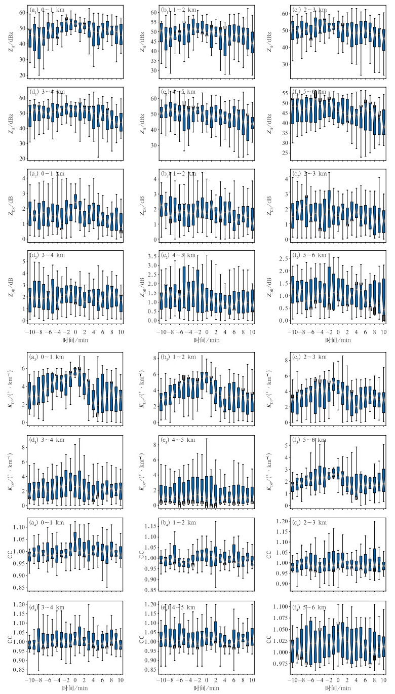 (1) 4 km以下ZH、ZDR和KDP平均值和中位数随着分钟降水强度增大而增大,而随着高度层升高,ZH和KDP有减小趋势,4 km以上的统计值小于4 km以下,其中ZH和KDP在0~1 km最大。在降水峰值发生前后,低层双偏振参量均存在先增大后减小的变化趋势,在分钟降水极值前3~10 min增长,极值后2~5 min减小。