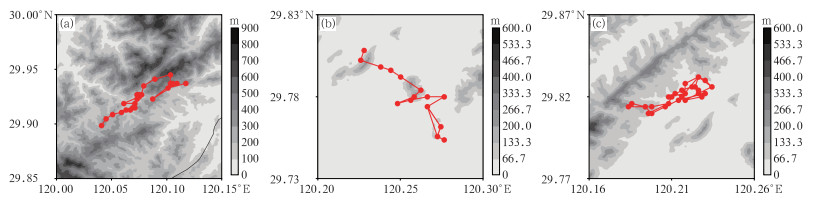 图 5 (a) 2023年7月22日16:05—16:25杭州富阳,(b)2024年7月12日14:10—14:26绍兴诸暨和(c)2024年7月14日15:10—15:35绍兴诸暨风暴追踪 注:图中阴影为高精度地形。 Fig. 5 Storm tracking from (a) 16:05 BT to 16:25 BT 22 July 2023 in Fuyang of Hangzhou, (b) 14:10 BT to 14:26 BT 12 July 2024 in Zhuji of Shaoxing, and (c) 15:10 BT to 15:35 BT 14 July 2024 in Zhuji of Shaoxing |