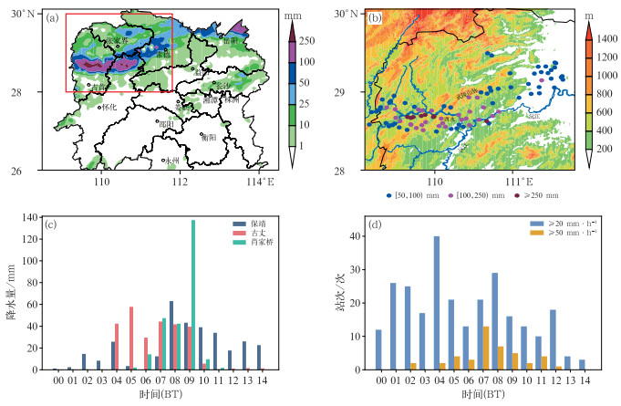 图 1 2023年6月(a,b)29日20:00至30日20:00(a)累计降水量(填色)和(b)累计降水量≥50 mm的站点(彩色圆点)和地形(填色),(c,d)30日00:00—14:00(c)代表站小时降水量和(d)小时雨强≥20 mm·h-1、≥50 mm·h-1站次 注:图b为图a中红框区域。 Fig. 1 (a) The accumulated precipitation (colored), (b) the stations with accumulated precipitation ≥50 mm (color dot) from 20:00 BT 29 to 20:00 BT 30 and terrain (colored), (c) hourly precipitation of representative stations and (d) number of stations with hourly precipitation intensity greater than 20 mm·h-1 and 50 mm·h-1 respectively from 00:00 BT to 14:00 BT 30 June 2023 |