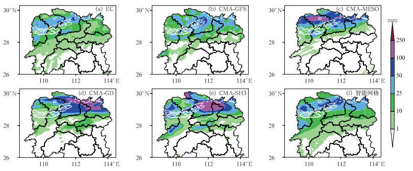 图 10 模式和客观产品2023年6月29日08:00起报的29日20:00至30日20:00累计降水量预报(填色)和实况(白线,≥50 mm) Fig. 10 The observed (white line, ≥50 mm) and forecasted accumulated precipitation (colored) from 20:00 BT 29 to 20:00 BT 30 by models and objective product initiated at 08:00 BT 29 June 2023 |