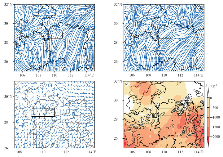 (3) 湘西地区复杂地形地貌为暴雨预报增加了不确定性。此次特大暴雨发生在云贵高原向洞庭湖平原过渡的区域,区域内地形地貌极为复杂,而地形对MCS的触发、组织以及移动和传播具有重要影响。Houze(2014)研究表明,如果复杂地形背景下大气是浮力不稳定的,那么大气对地形响应会激发出积雨云,这些积雨云将进一步发展为MCS。其可能的机制包括中小尺度地形对夜间增强的西南气流的阻挡抬升和山地河谷间辐射降温差异导致的山谷风和高温度梯度等(徐珺等,2018;Smith,2019)。当天湘西地区是满足浮力不稳定的,过程期间该区域也出现了多个γ-MCS的新生,从图 1b也可以看出,强降雨主要发生在武陵山脉南侧和沅江支流酉水河谷地带,地形为强对流的发展和特大暴雨的发生提供了有利条件,然而目前的数值模式很难精细描述地形影响及其所产生的物理过程(Ebert and McBride, 2000),预报员的主观经验也存在偏差,从而增加了预报难度。