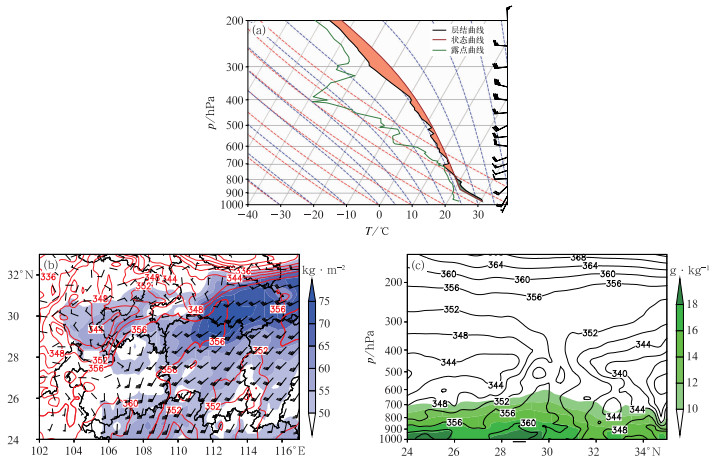 图 3 2023年6月(a)29日20:00怀化站探空,(b, c)30日02:00(b)整层水汽含量(填色)、850 hPa假相当位温(等值线,单位:K)和风场(风羽),(c)比湿(填色)和假相当位温(等值线,单位:K)沿110°E的垂直剖面 注:图c中黑色粗实线代表暴雨区位置。 Fig. 3 (a) T-lnp of Huaihua Station at 20:00 BT 29, (b) vertically integrated water vapour (colored), 850 hPa pseudo-equivalent potential temperature (contour, unit: K) and wind field (barb), and (c) cross-section of specific humidity (colored) and pseudo-equivalent potential temperature (contour, unit: K) along 110°E at 02:00 BT 30 June 2023 |