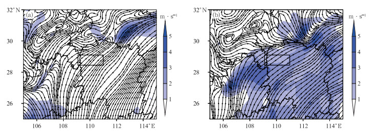 图 8 2023年6月(a)29日22:00和(b)30日04:00 850 hPa风速脉动(填色)和流场(流线) 注:方框代表暴雨区。 Fig. 8 850 hPa wind speed fluctuation (colored) and wind stream (streamline) at (a) 22:00 BT 29 and (b) 04:00 BT 30 June 2023 |