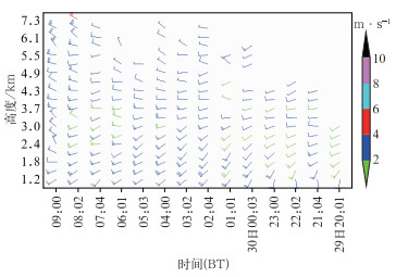 图 9 2023年6月29—30日吉首雷达风廓线 注:彩色代表水平风速的均方根误差。 Fig. 9 Wind profile of Jishou Radar during 29-30 June 2023 |