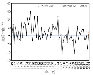 图 1 1949—2024年西北太平洋和南海台风逐年生成个数 Fig. 1 Annual numbers of typhoons generated in the Northwest Pacific and South China Sea in 1949-2024 |