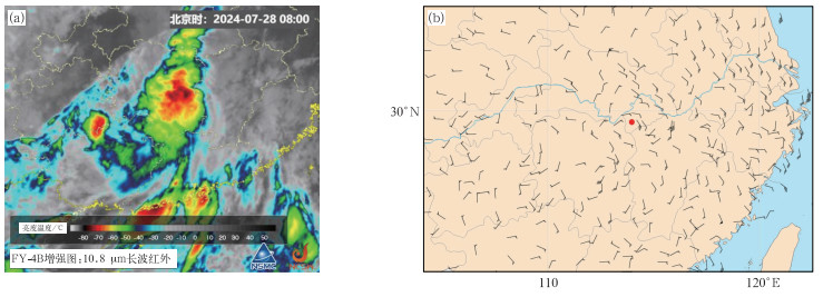 图 10 2024年7月28日08:00台风“格美”残涡的(a)FY-4B红外云图,(b)10 m风场 注:红色圆点表示残涡估计中心。 Fig. 10 (a) FY-4B infrared image and (b) 10 m wind field of Typhoon Gaemi remnant vortex at 08:00 BT 28 July 2024 |