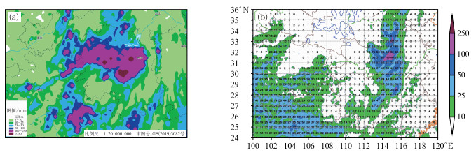 图 12 2024年7月28日08:00至29日08:00(a)实况和(b)26日08:00 ECMWF起报的累计降水量 注:图b中数字和填色为降水量, 单位:mm。 Fig. 12 (a) The observed and (b) forecast by ECMWF initiated at 08:00 BT 26 July of accumulated precipitation from 08:00 BT 28 to 08:00 BT 29 July 2024 |