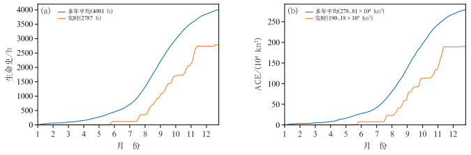 2024年台风的累积活动时长为2787 h,虽然全年的台风生成个数与多年平均基本持平,但台风的累积活动时长较多年平均(4001 h)明显偏短(图 4a)。台风累积动能(accumulated cyclone energy, ACE)为190.18×104 kn2(1 kn=1.852 km·h-1),较多年平均ACE(278.81×104 kn2) 偏低约32% (图 4b)。可见,虽然2024年的台风个数与气候平均值基本持平,且超强台风的个数和占比明显高于气候平均值,但整体活跃程度仍明显偏弱。