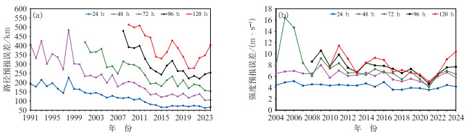 图 7 中央气象台逐年台风平均(a)1991—2024年路径和(b)2004—2024年强度预报误差 Fig. 7 The average (a) track forecast error in 1991-2024 and (b) intensity forecast error in 2004-2024 of typhoons by National Meteorological Centre |