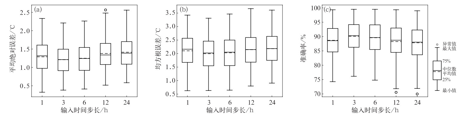 2 结果分析 2.1 模型预报能力评估 2.1.1 不同输入步长模型预报能力评估使用1、3、6、12、24 h共5种不同输入步长构建的模型对2023年A1、A2、A3、A5、A6、A7、A8、A0共8个交通气象站的路面温度进行模拟预报,对每个输入方案所有预报时效的评估指标绘制箱线图(图 2),用以直观比较不同输入步长的模型预报效果。总体来说模型效果比较稳定,各评估指标对不同方案均表现出了一致的优劣特征,结果表明,3 h输入步长的模型预报性能表现最佳,其平均绝对误差为0.38~2.21℃,均方根误差为0.63~3.31℃,准确率为76.15%~99.48%;24 h的输入时间步长方案预报性能表现最差,其平均绝对误差为0.58~2.56℃,均方根误差为0.91~3.61℃,准确率为69.98%~98.97%。从模型预报效果并非随着输入步长的增加单调变化可以看出,过多地增加输入时间步长并不会有效增加模型预报性能,但是输入时间步长过少也会降低模型的拟合稳定度,使用合适的时间步长输入在有利于实际操作和减少模型训练时间的同时,也有利于建立预报性能更优的模型。基于这一结果,本文后续将采用预报性能最佳的3 h输入步长模型继续进行研究讨论,后文所提及的模型均为此类。